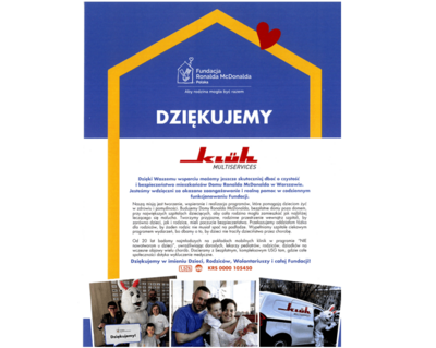 Podziękowanie dla Klüh Facility Services od Fundacji Ronalda McDonalda