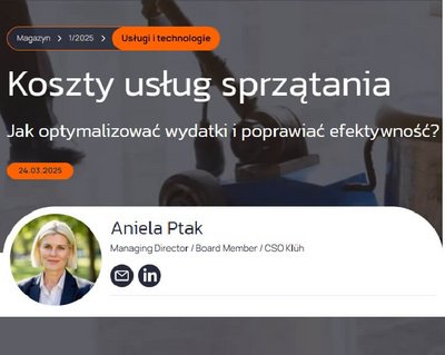 O kosztach usług sprzątania, optymalizacji wydatków i poprawie efektywności wypowiedziała się na łamach Magazynu "Obiekty" w wydaniu 1/2025 Aniela Ptak Dyrektor Zarządzająca Klüh Facility Services